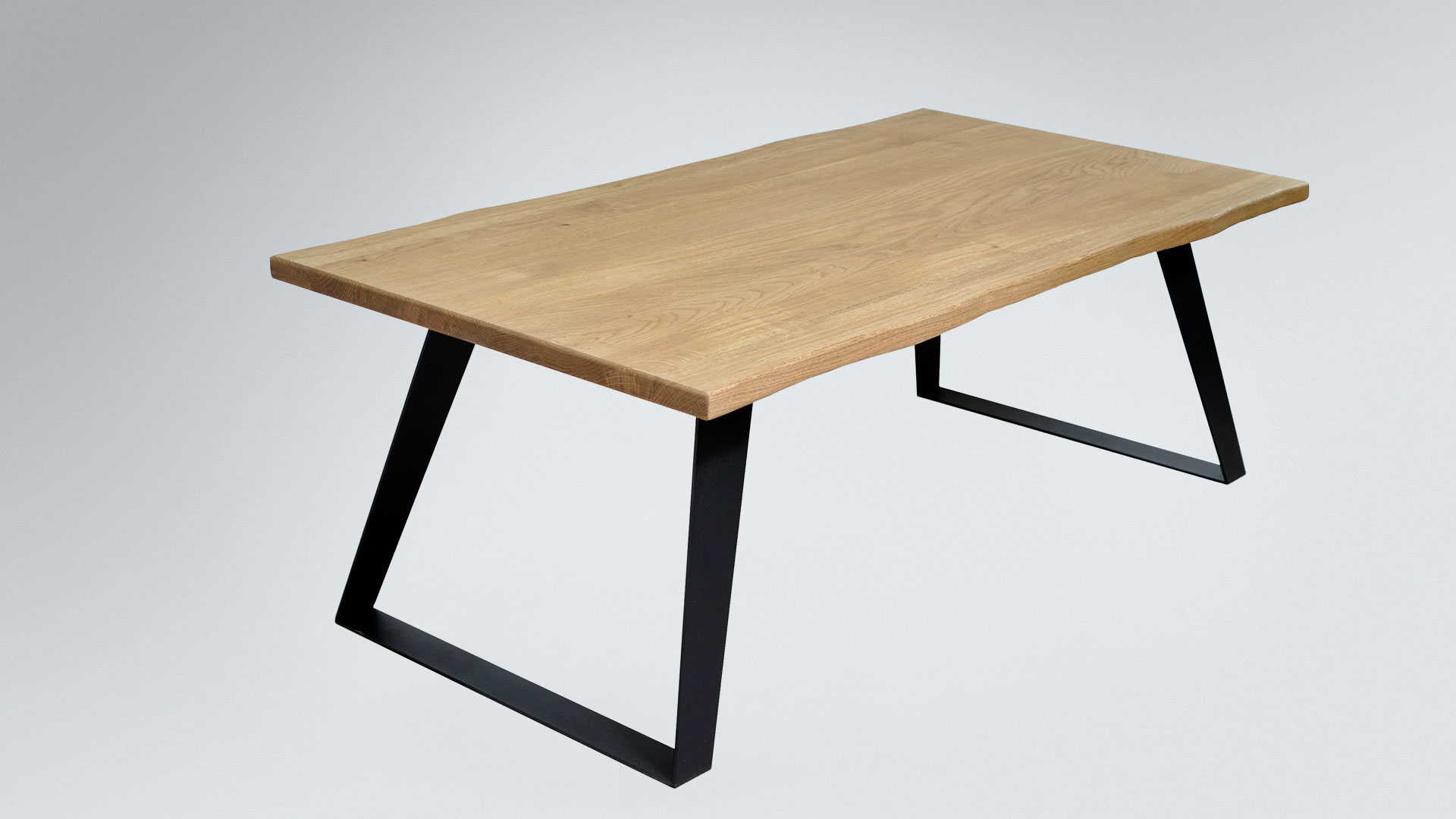 Gekonnt kombiniert Couchtisch "Infinero" die Tischplatte aus massivem Wildeichenholz mit Kufen aus schwarzem Metall. Die natürliche Baumkante und die schräg zulaufenden Kufen schaffen ein sehr edles Aussehen.