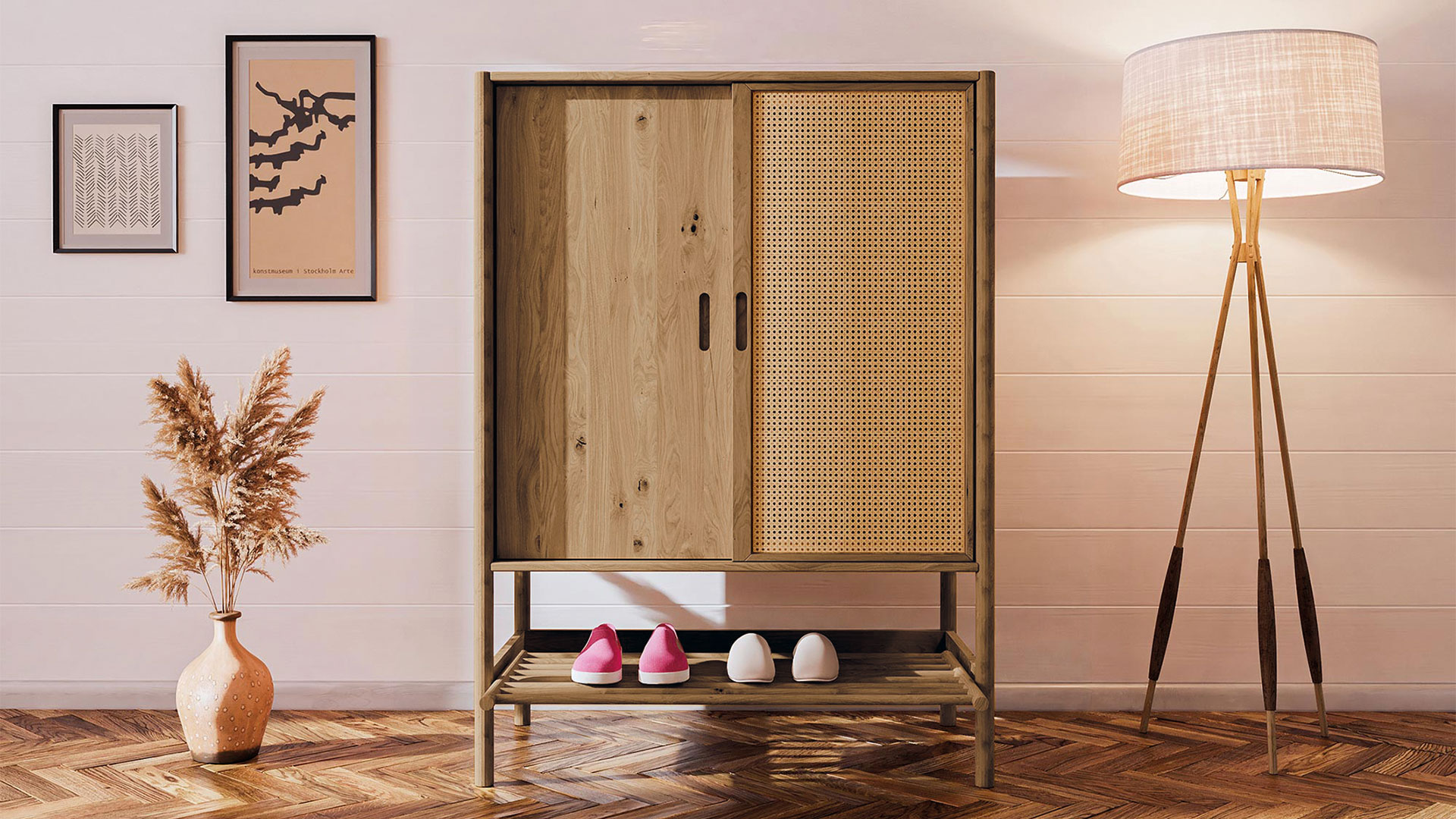 Platzsparende Schiebetüren. Ausziehbare Kleiderstange. Geräumiger Schuhrost. Dielenschrank "Rota" kümmert sich gerne um Ordnung in Ihrem Flur. Und das mit viel Charme.