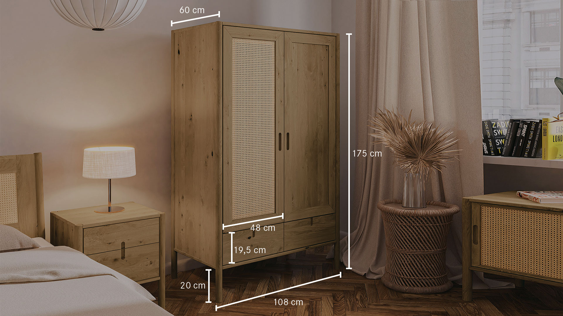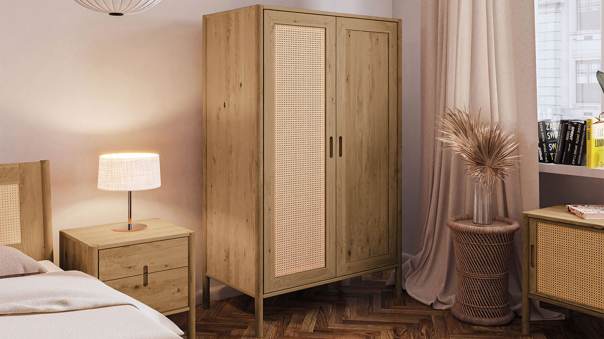 Natürlich, leicht und einfach zauberhaft: Das kunstvolle Wiener Geflecht aus Rattan im modernen Materialmix mit Massivholz machen "Rota" zu etwas ganz Besonderem. Was den Kleiderschrank sonst noch auszeichnet?