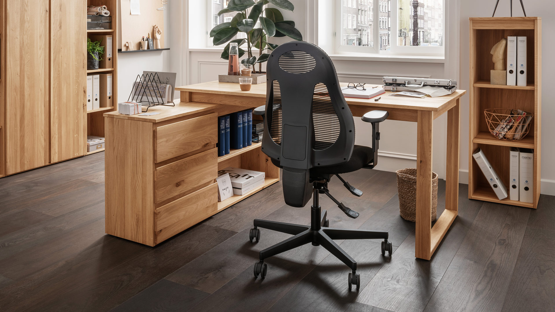 Dieser Eckschreibtisch verbindet großzügige Arbeitsfläche mit durchdachter Ordnung. Massive Wildeiche mit lebendiger Maserung schafft eine warme, ruhige Atmosphäre und unterstützt fokussiertes Arbeiten. Das integrierte Sideboard bietet praktischen Platz für Unterlagen, Bürobedarf und auch für einen Drucker. Es ist wahlweise links oder rechts erhältlich. Die fest mit der Sideboard-Deckplatte verschraubte Tischplatte sorgt für hohe Stabilität und ein stimmiges Gesamtbild. Mit Sorgfalt und Sachverstand in Deutschland gefertigt – für langlebige Qualität mit natürlicher Ausstrahlung.