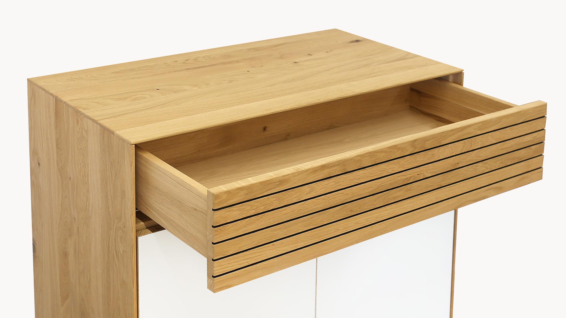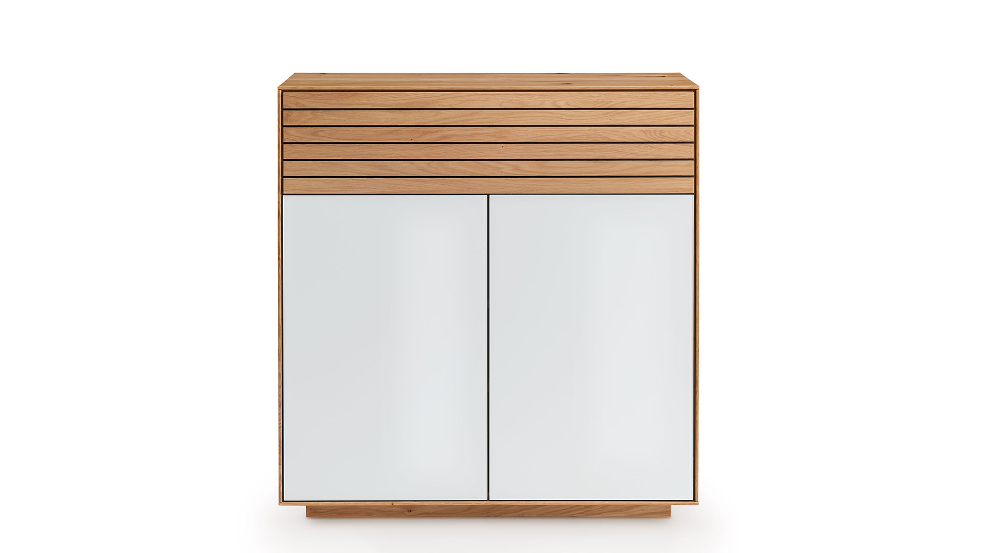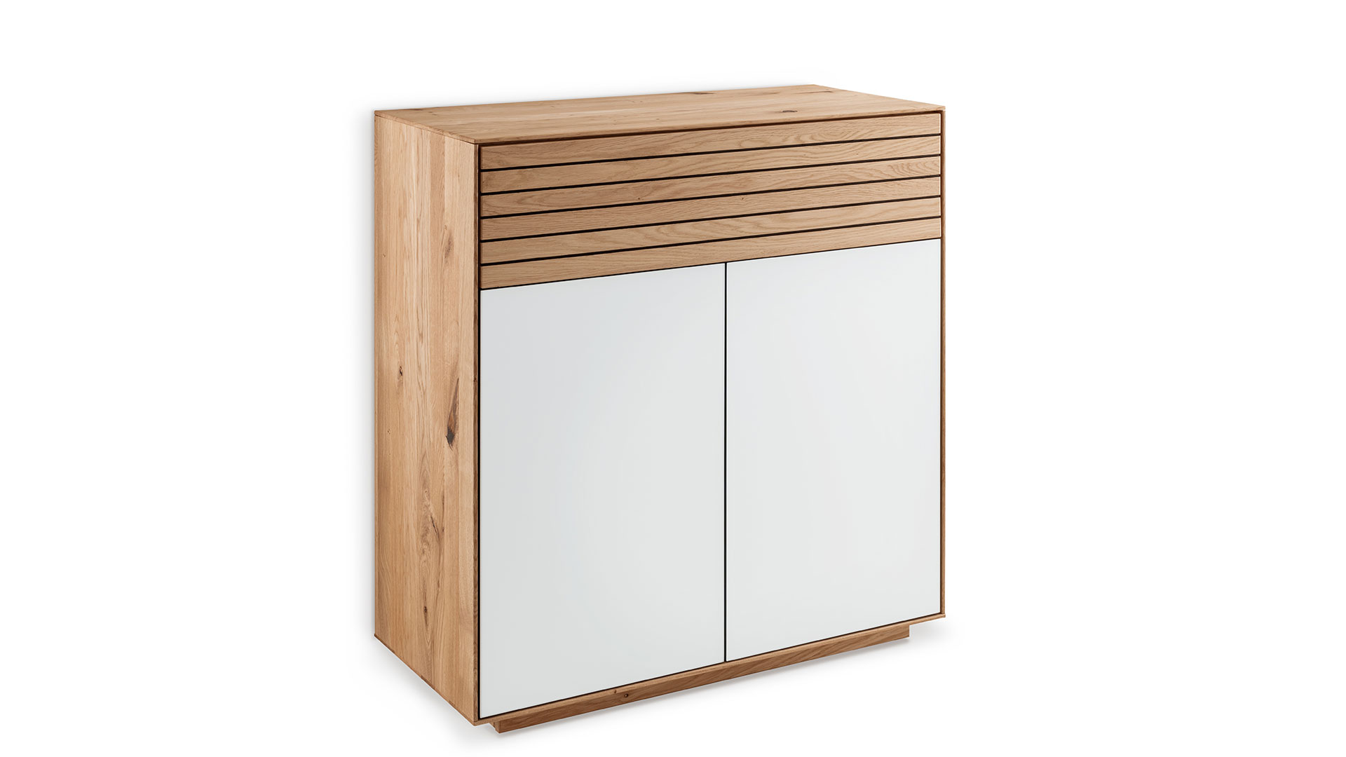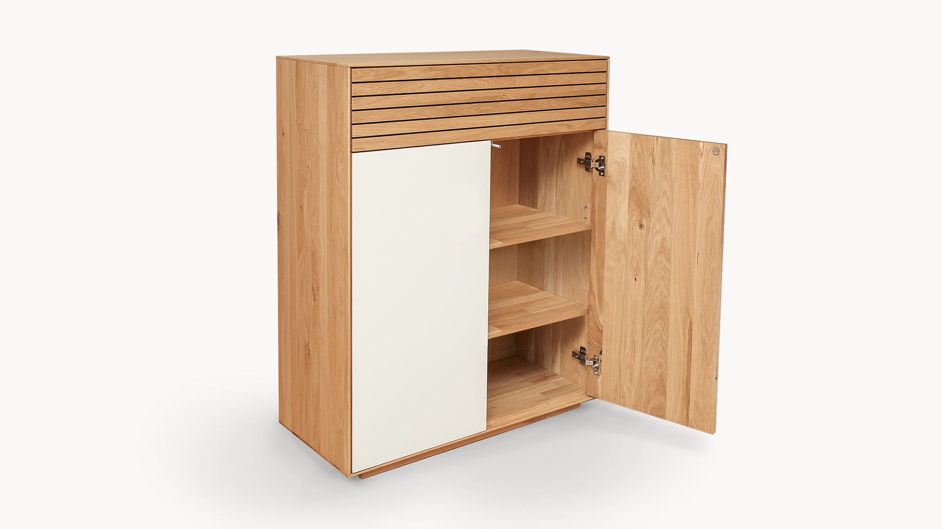 Kommode "Fiella" (links) in Weißglas und Wildeiche für eine moderne, einladende Optik