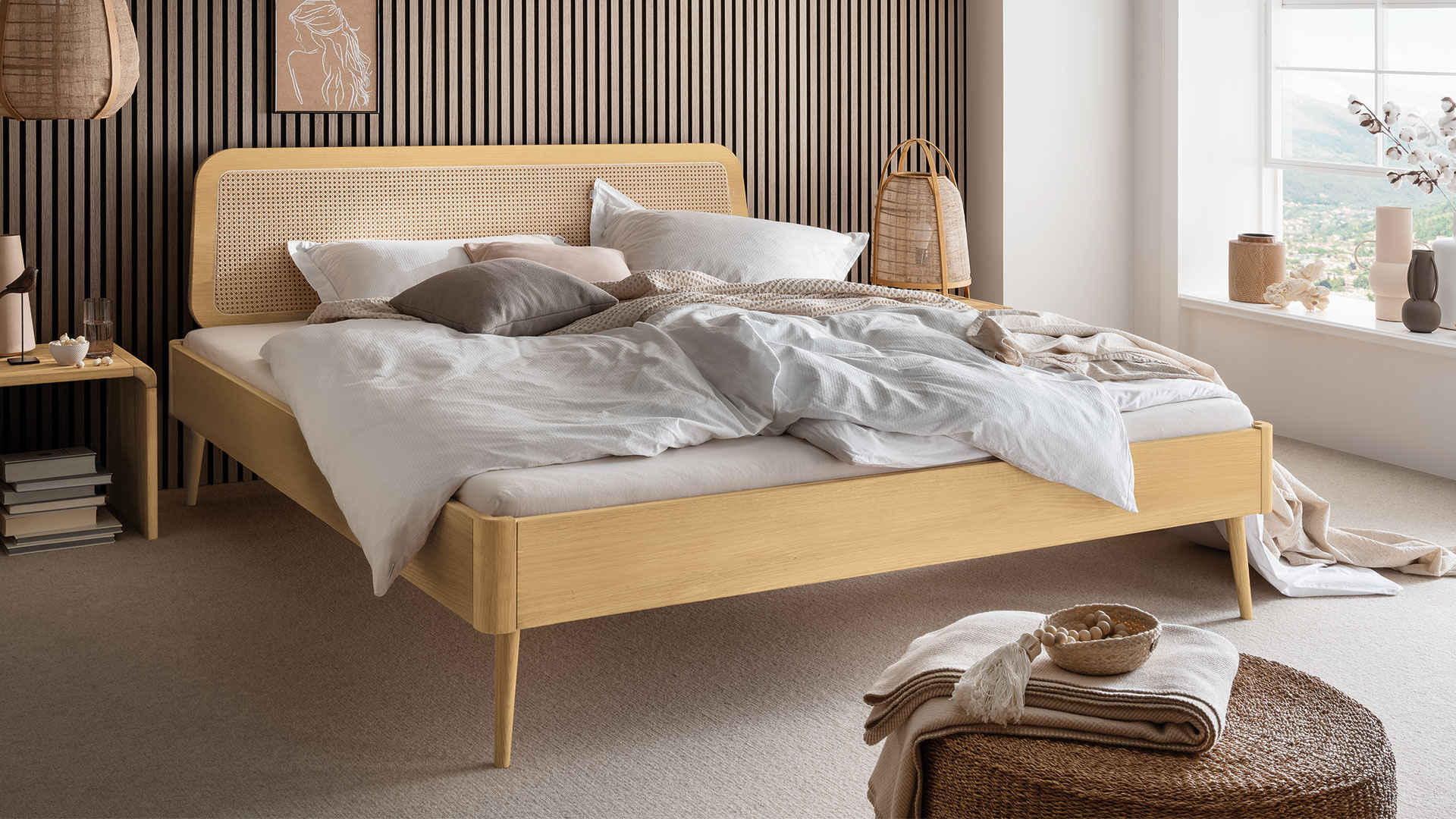 Je nach Lust und Laune kann das Kopfteil unkompliziert gewendet werden. Auf der einen Seite haben Sie das klassische Wiener Geflecht, auf der anderen ist das Kopfteil aus durchgehendem Massivholz. Was ist Ihr Favorit? Wiener Kaffeehaus-Stimmung oder ein klassisch reduziertes Design? Wenn Ihnen nur der hochwertig gefertigte Rahmen gefällt oder das Bett unter einer Dachschräge stehen soll, ist das auch kein Problem: Das Bett ist auch als Liege, also komplett ohne Kopfteil, verfügbar. Beim Holz haben Sie die Wahl zwischen robuster Buche, eleganter Kernbuche und markanter Wildeiche.