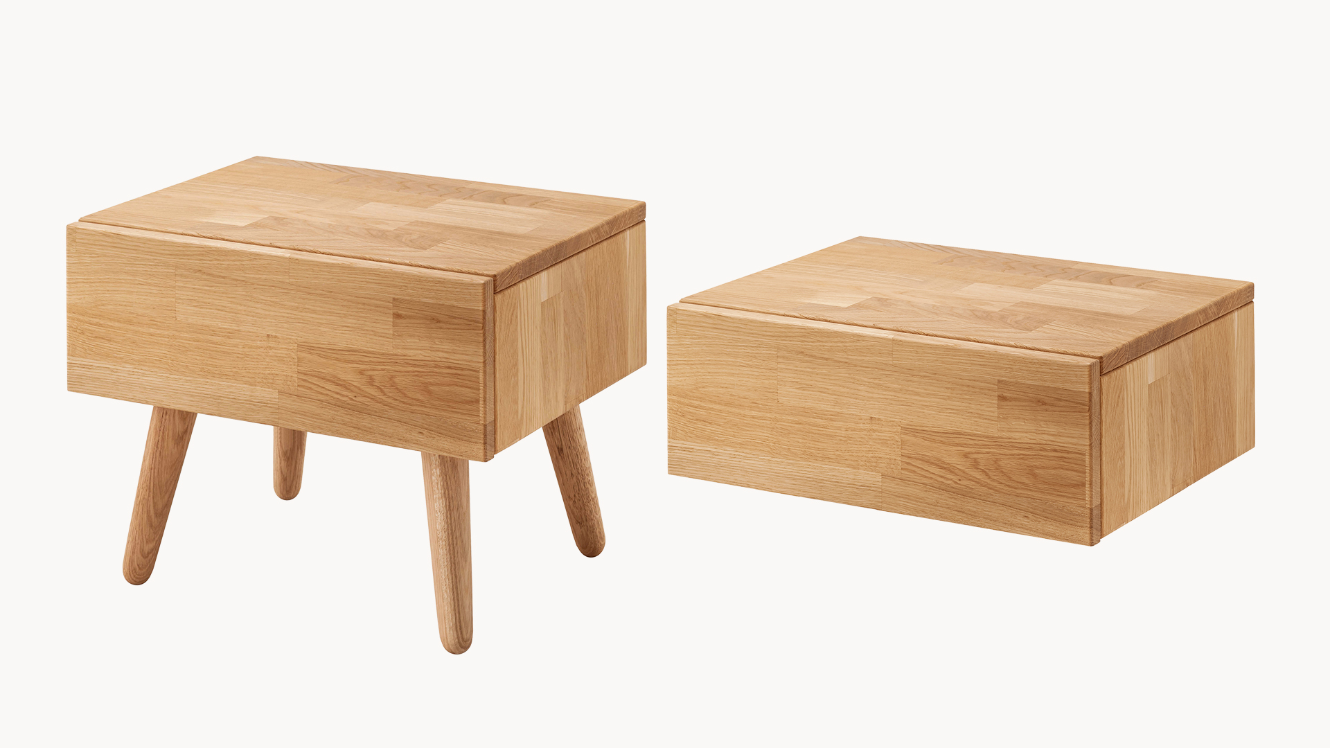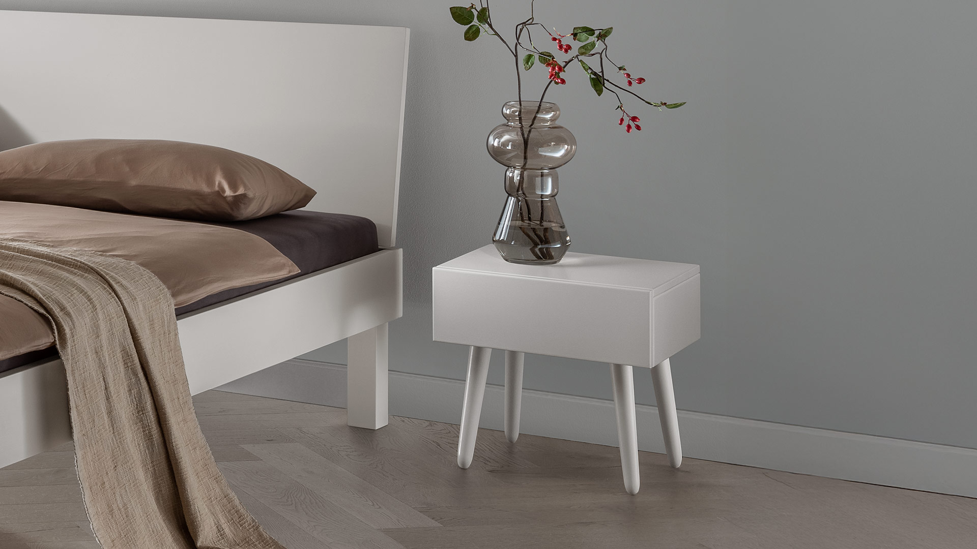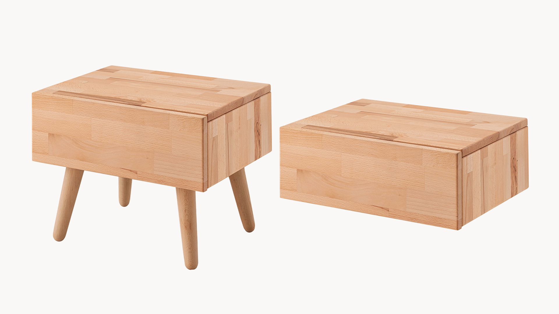 rechteckiger Nachttisch mit Schublade und runden, schräg zulaufenden Füßen, kann auch als Hänge-Nachtkonsole ohne Füße an die Bettseite montiert werden