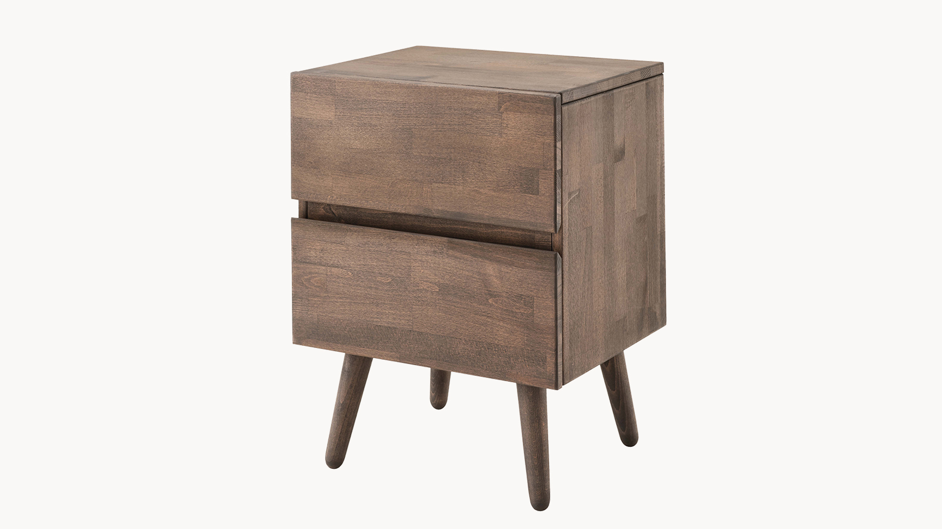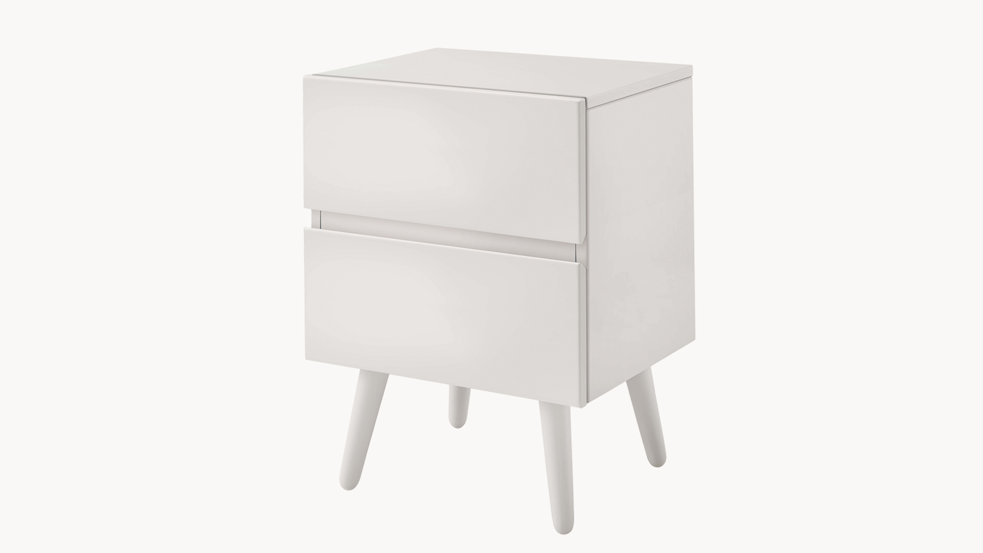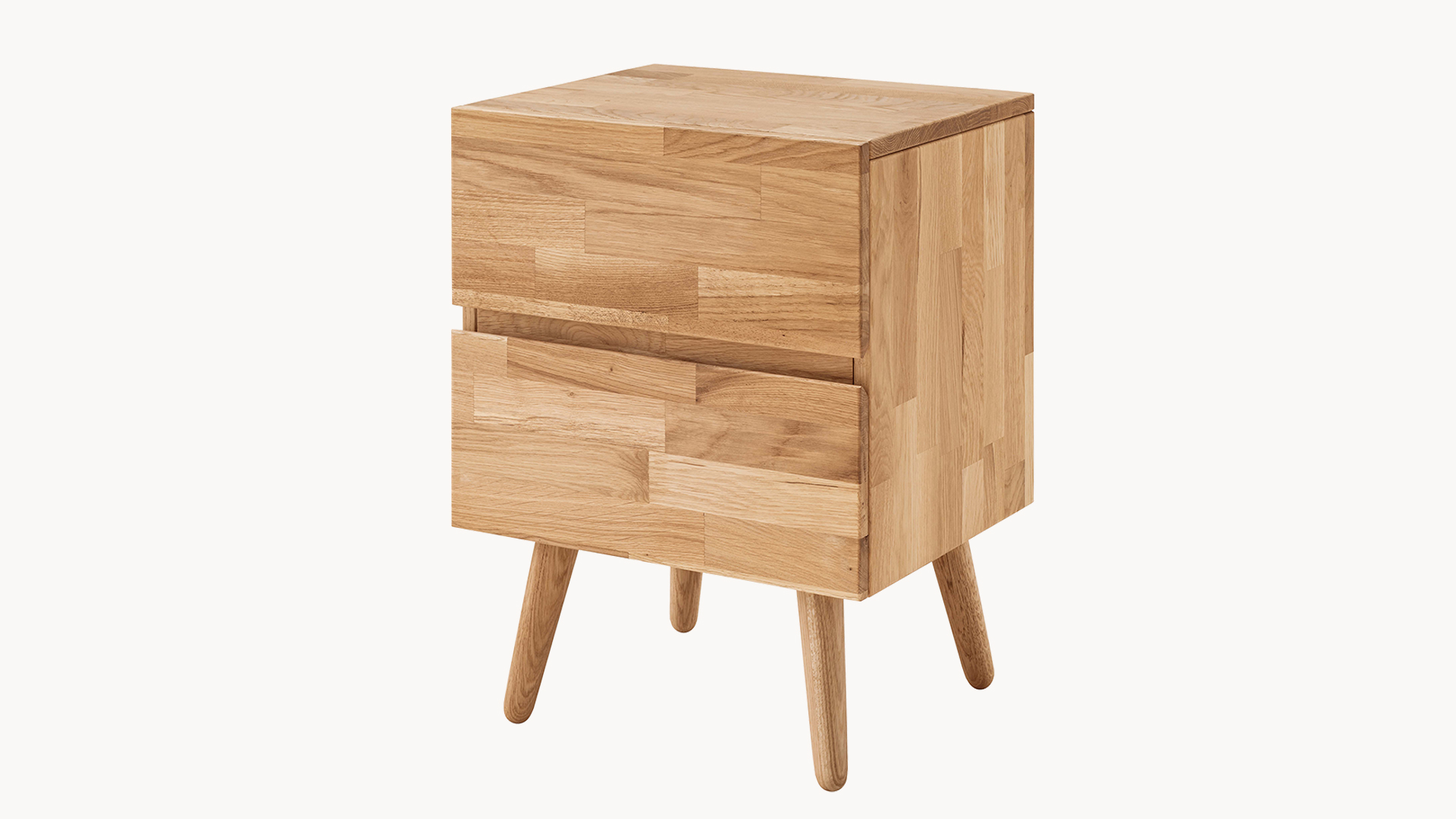 rechteckiger Nachttisch mit 2 Schubladen und runden, schräg zulaufenden Füßen, kann auch ohne Füße verwendet werden