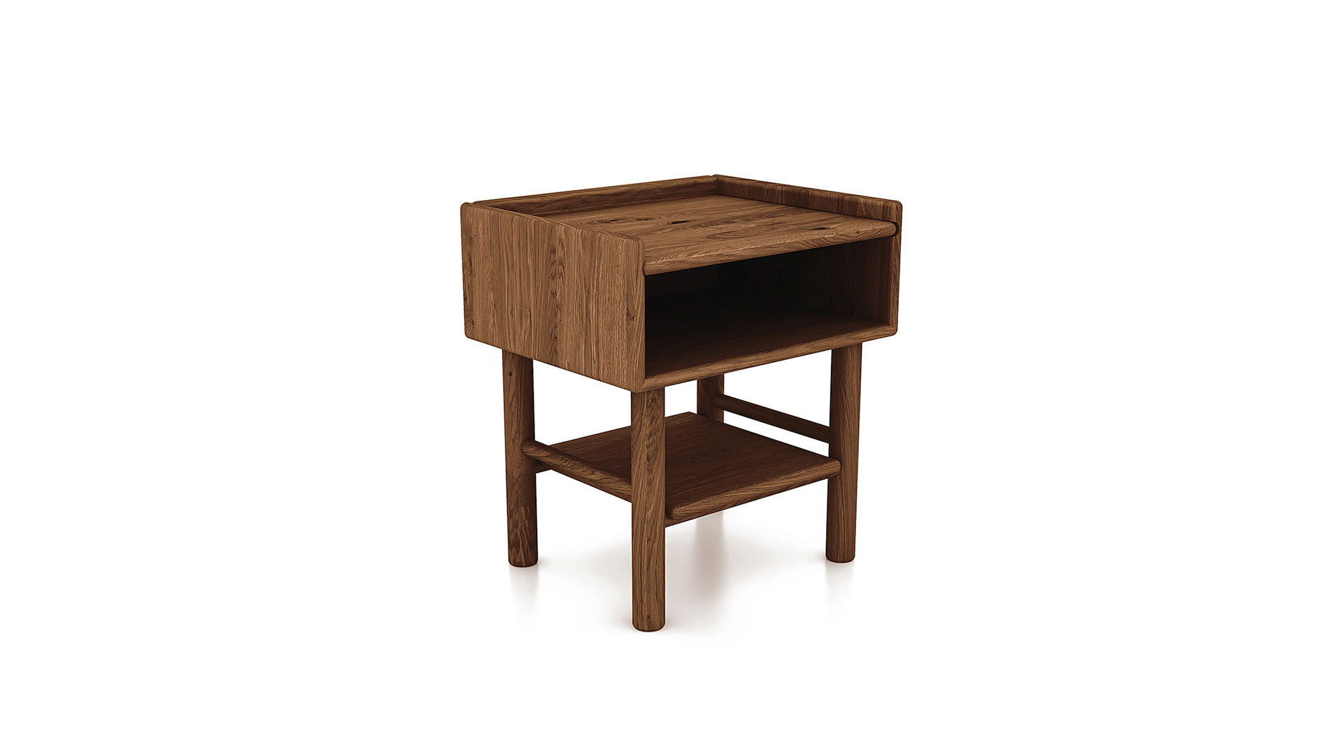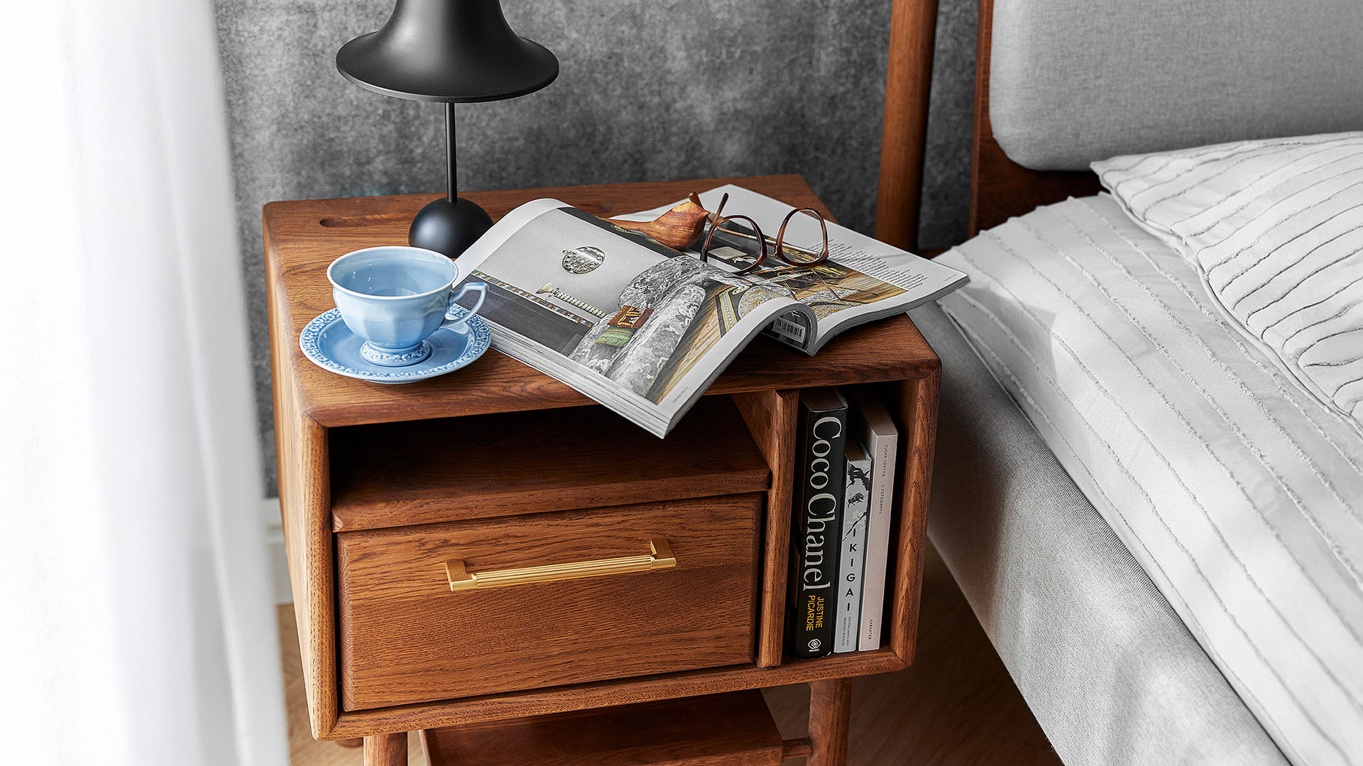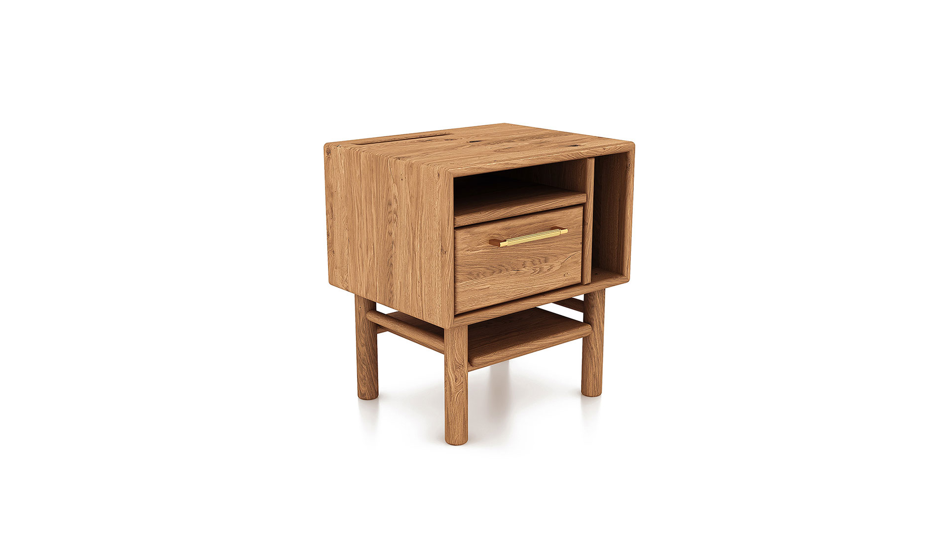 Serea" verleiht Ihrem Schlafzimmer den unverwechselbaren Charme des Mid-Century-Designs. Sanfte Linien, warme Holzoberflächen und ein goldfarbener Griff schaffen eine Atmosphäre, die Eleganz und Geborgenheit verbindet. Ob mit Schublade für persönliche Schätze oder mit offener Ablage – beide Varianten bieten mit dem zusätzlichen Zwischenboden Platz für alles, was Sie in Reichweite wissen möchten. Das Besondere an Variante 01: Die Ablage lässt sich komplett herausziehen. Einfach ideal als Tablett fürs kleine Frühstück im Bett oder als praktische Unterlage für Ihr Laptop.