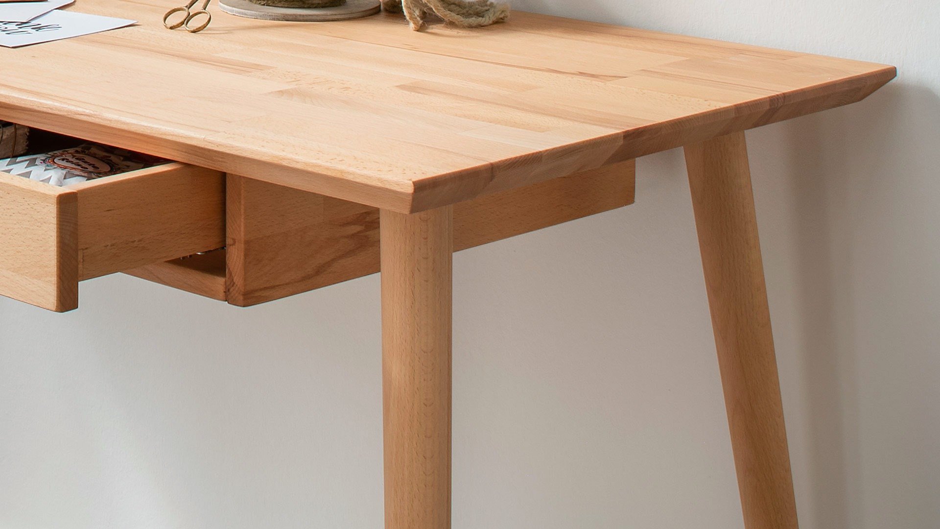 "Varilla" erhalten Sie in massiver Kernbuche oder in massiver Eiche mit geölter Oberfläche. Die Tischplatte ist mit einer eleganten Schweizer Kante verarbeitet - sie verjüngt sich also schräg nach innen. Die schlanken, abgerundeten Tischbeine verlaufen nach außen und werden nach unten schlanker.