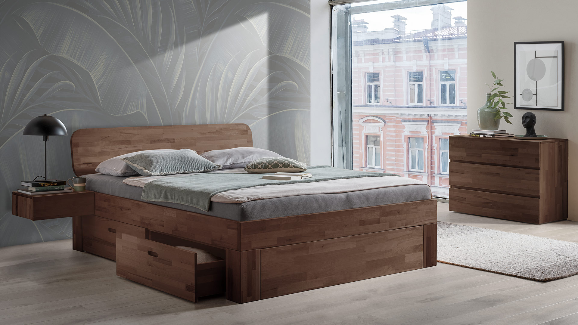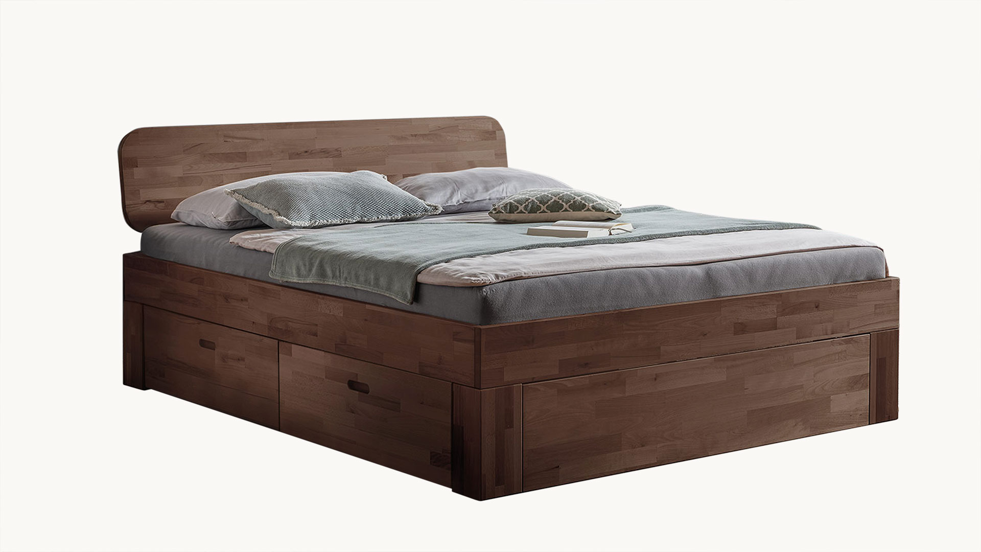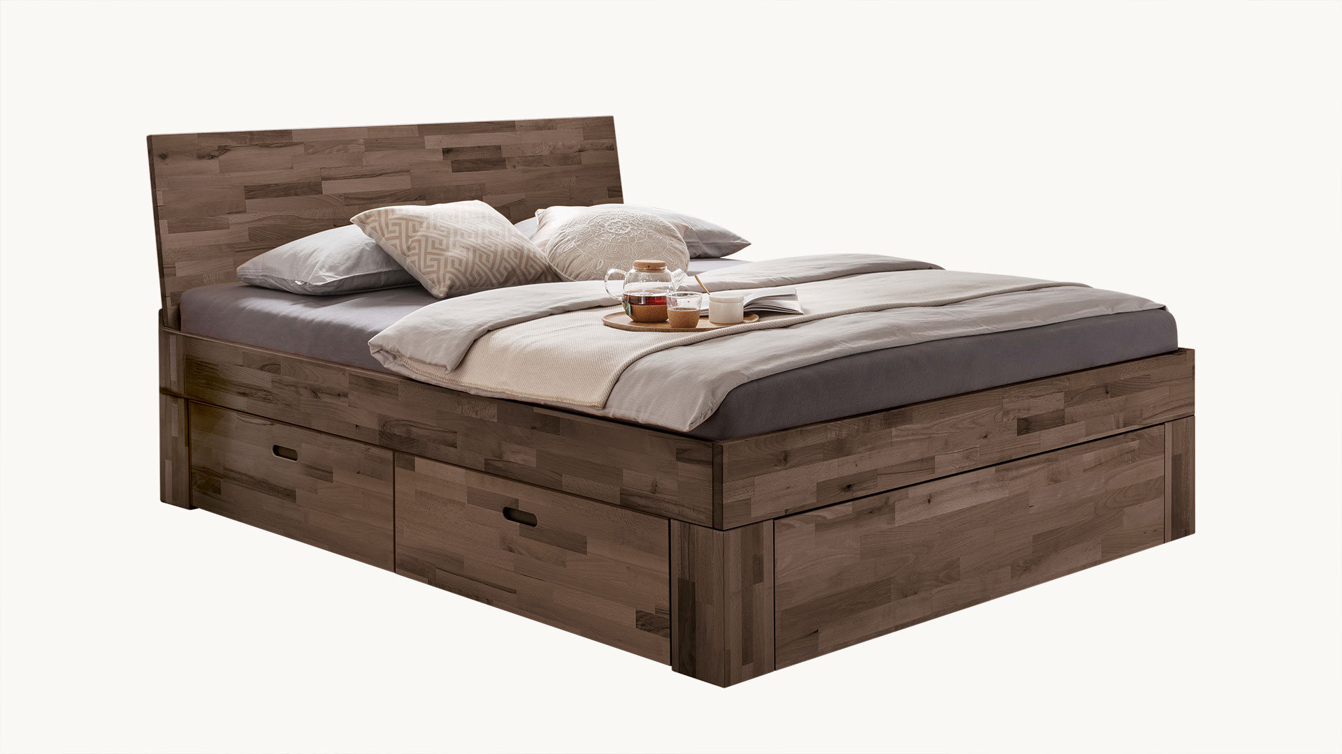 Schubkastenbett "Lunara" bringt viel Stauraum und zeitlose Eleganz mit sich, hier in Buche Mokka