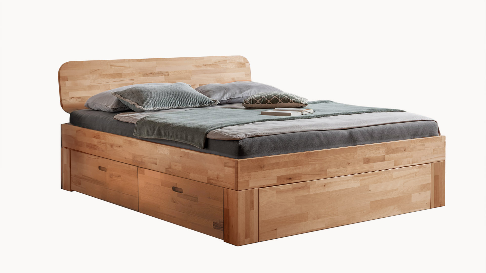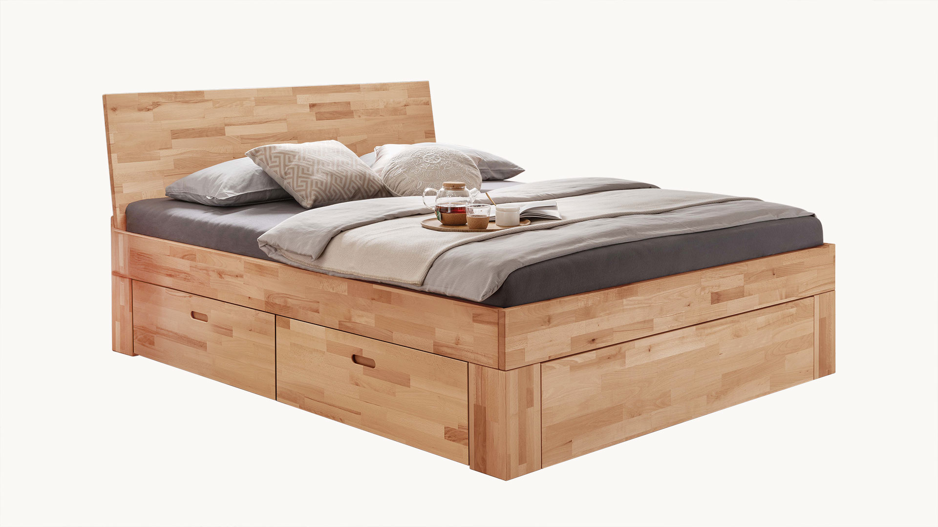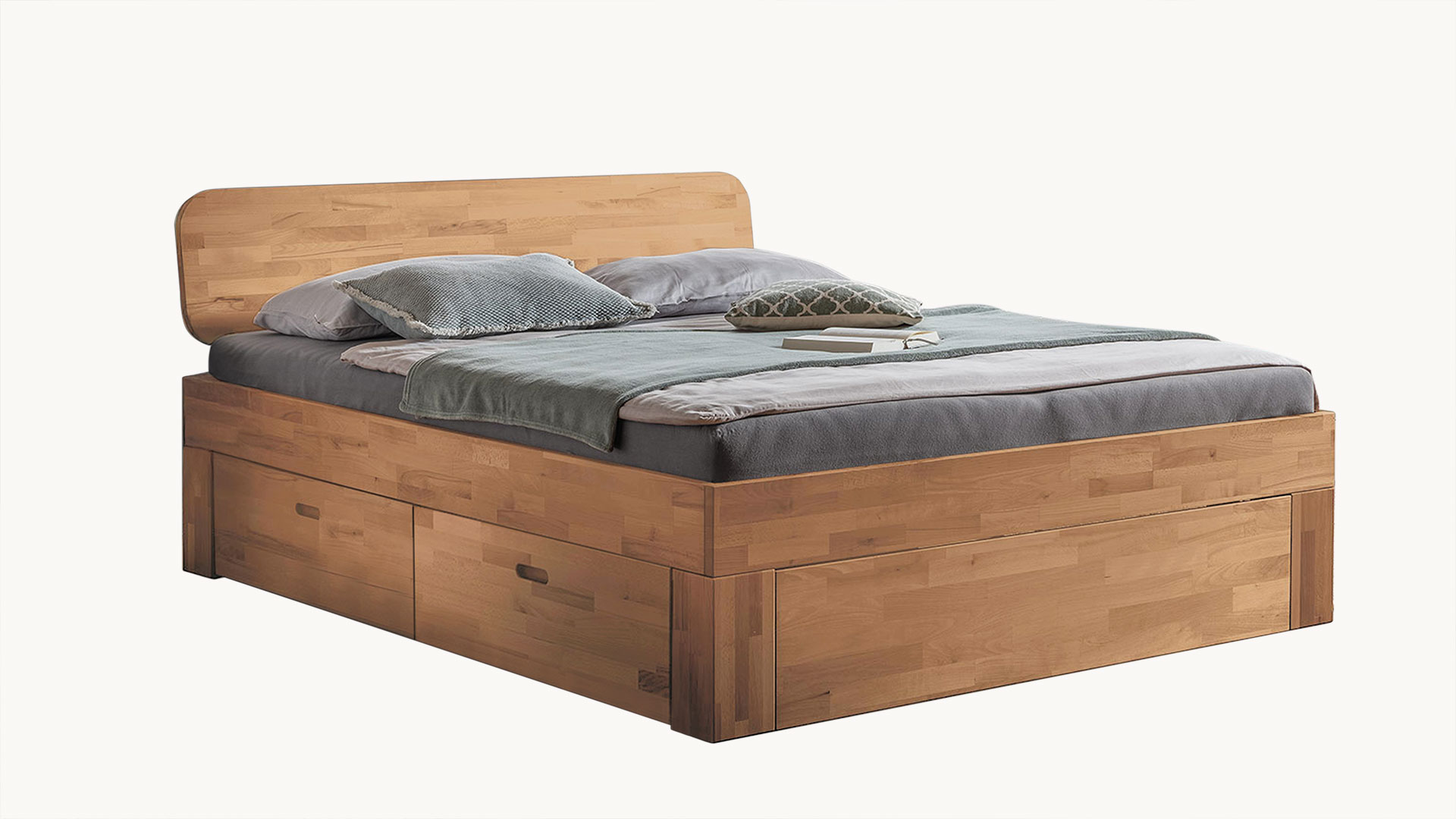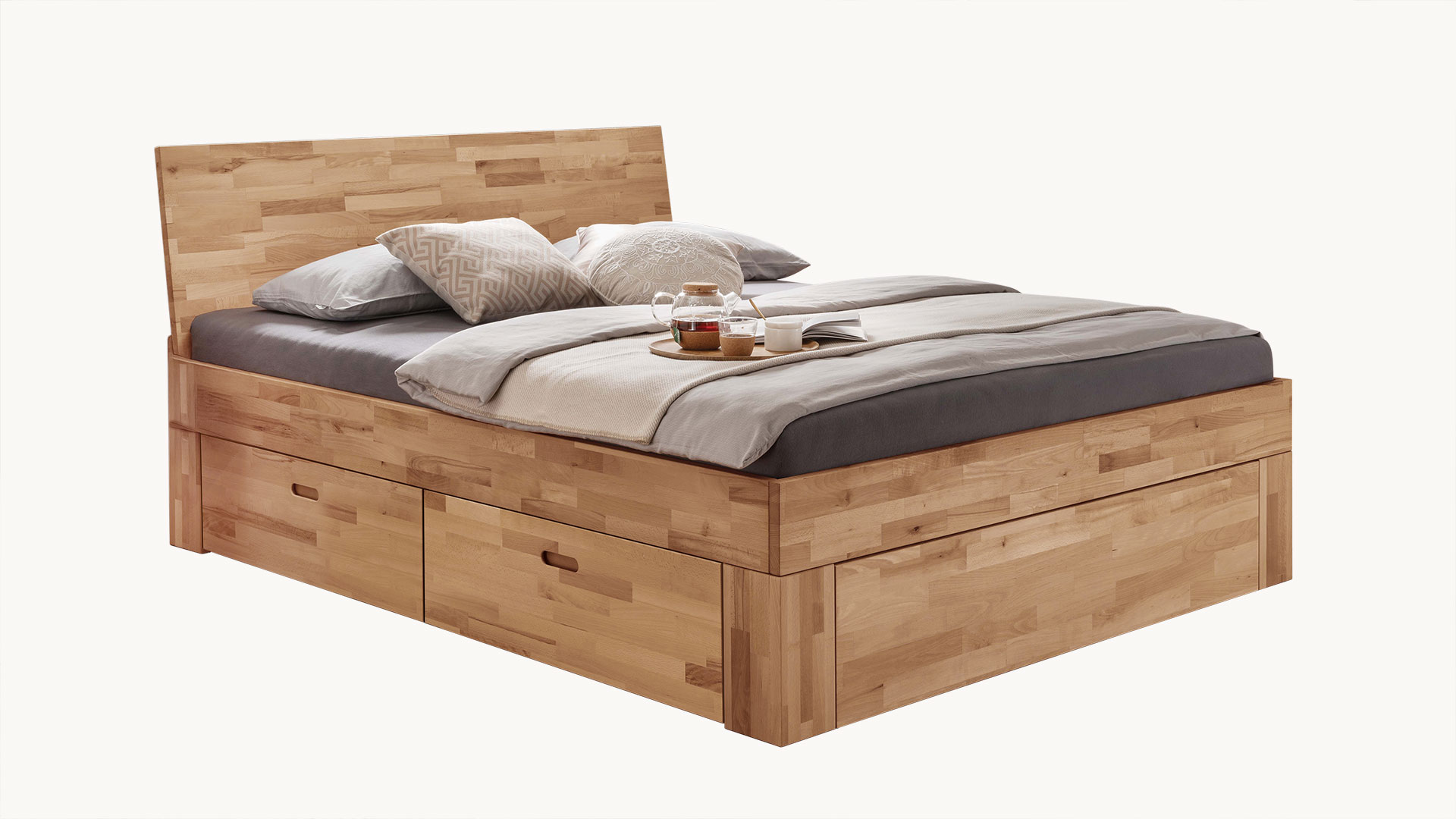 Damit das Schubkastenbett optimal zu Ihnen passt, stehen Ihnen zwei edle Holzkopfteile zur Auswahl. Auch bei den Holzarten können Sie sich für Ihren Favoriten entscheiden. Die massive Kernbuche überzeugt mit natürlicher, lebendiger Maserung, während Wildeiche durch ihre markante, zeitlose Ausstrahlung besticht. Tolle Farbakzente setzen Sie mit dem Buchenholz in dunkler Mokka-Farbe, während in Buche weiß-lasiert das Bett eine leichte und moderne Note mit sich bringt. Schubkastenbett "Lunara" vereint ein zeitloses Design mit praktischem Stauraum und passt mühelos in jedes Schlafzimmer.