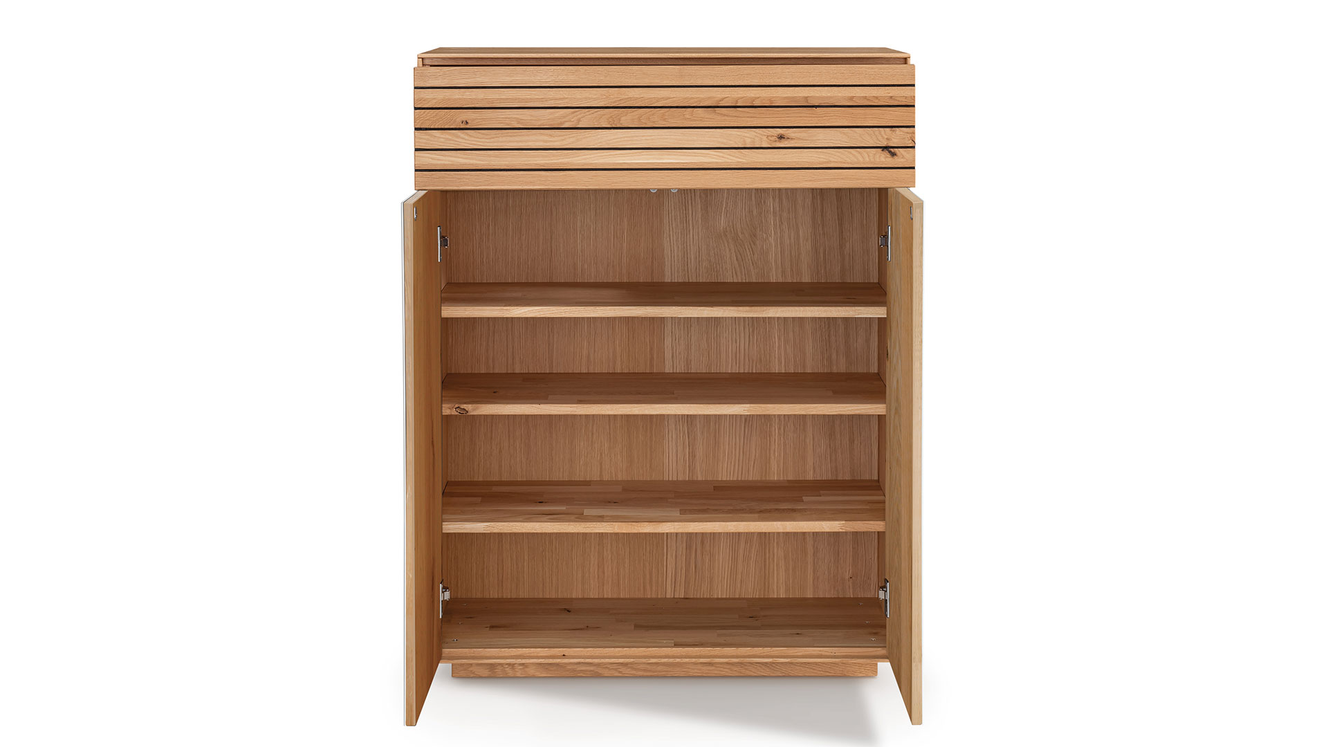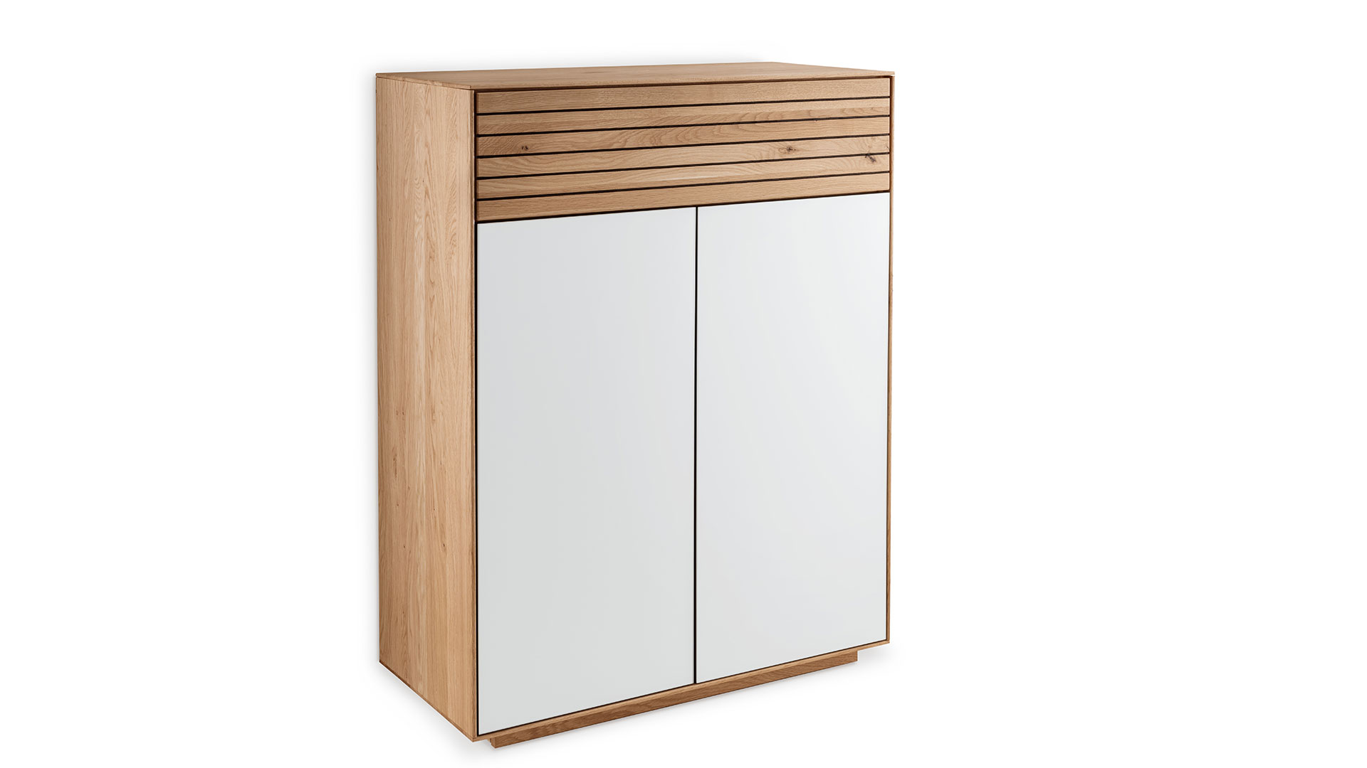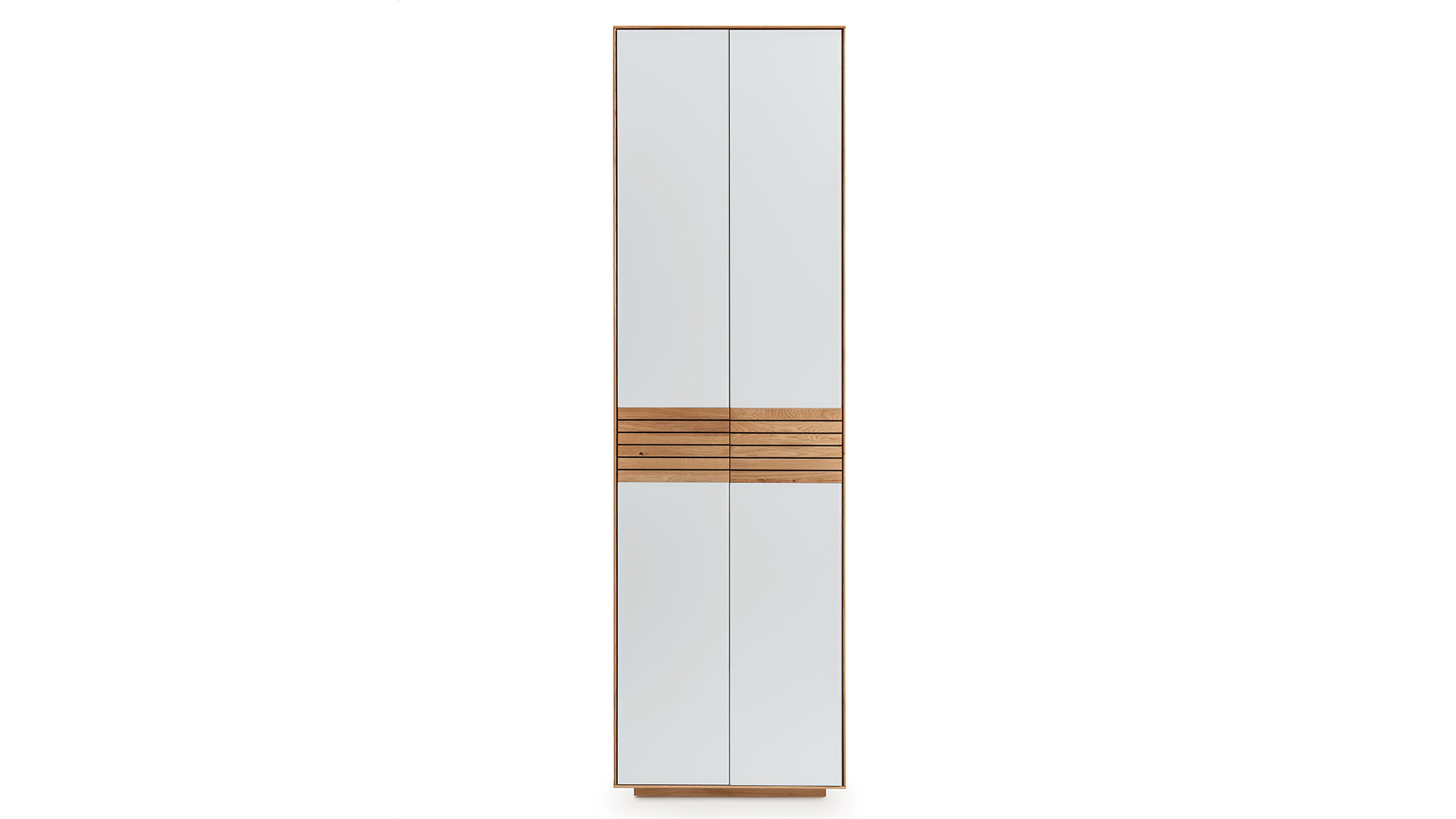 Schuhschrank "Fiella" bringt natürliche Wärme und modernen Charme in Ihren Flur. Die individuelle Maserung der massiven Wildeiche am Korpus trifft auf hell-freundliche Weißglastüren. Der Schuhschrank wirkt dadurch sowohl stilvoll als auch angenehm leicht. Hochwertige Holzakzente mit schwarz gebeizten Rillen an den Fronten lockern das Gesamtbild auf und passen so in jedes Zuhause.