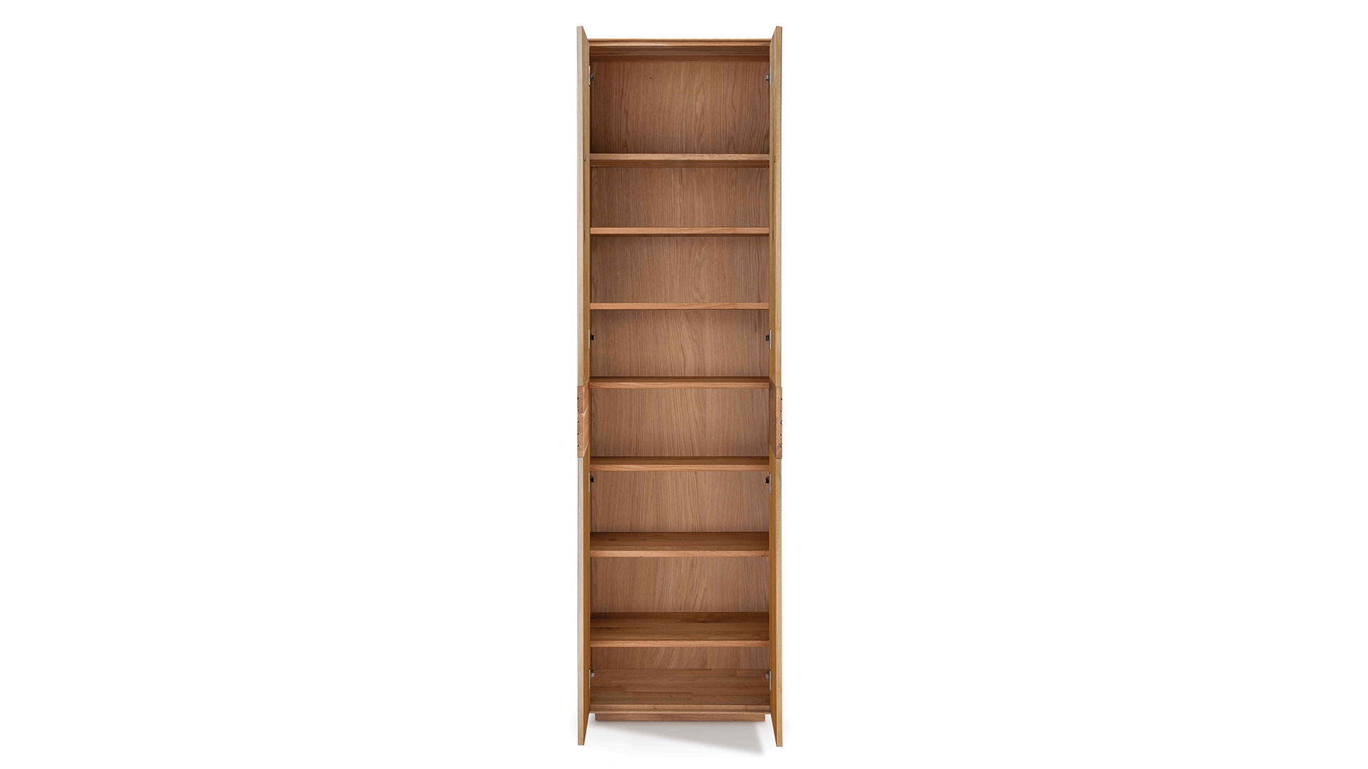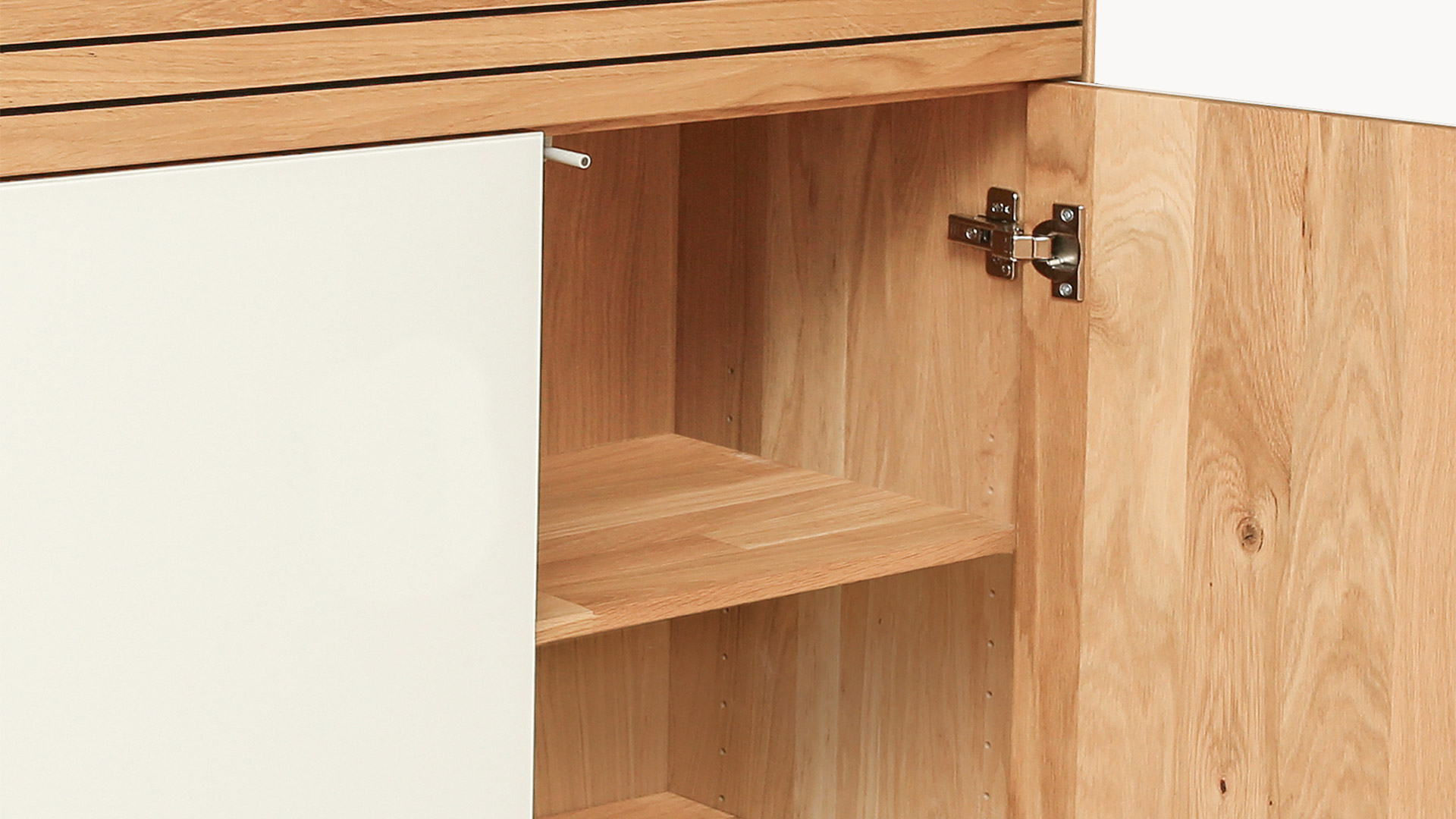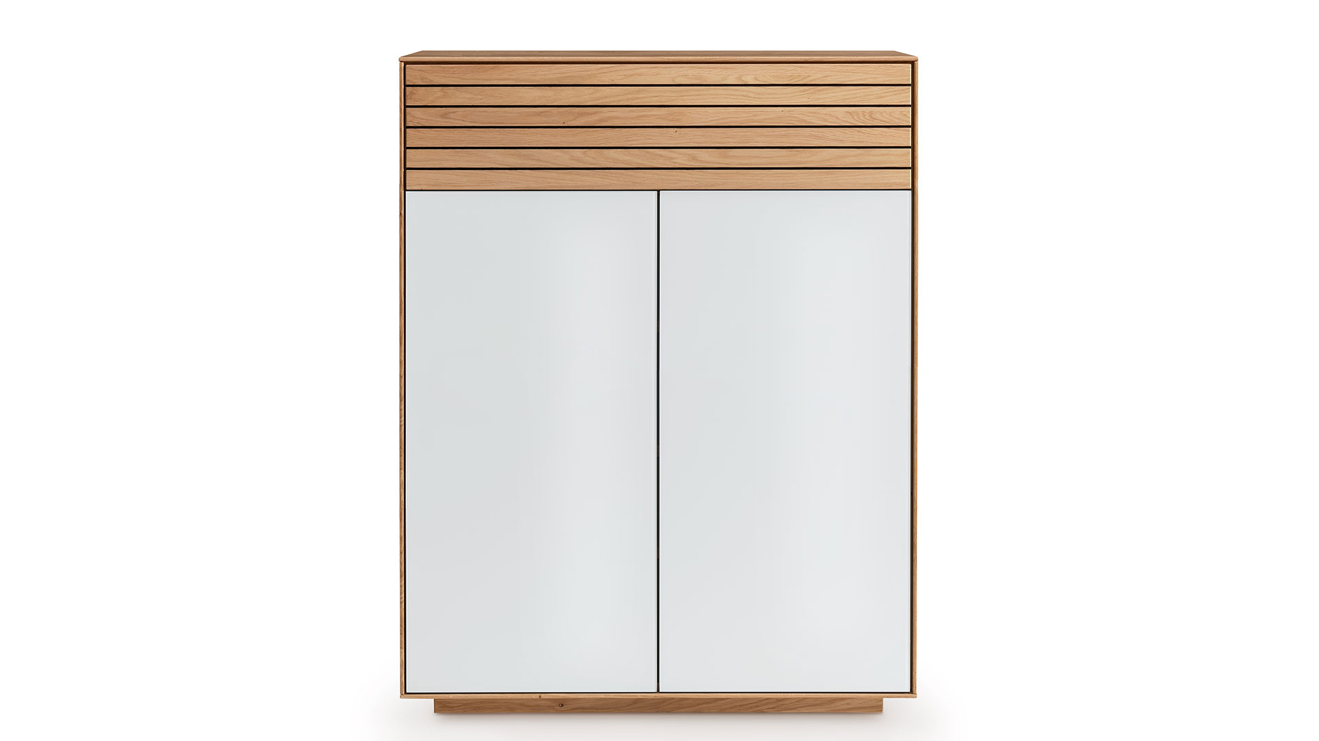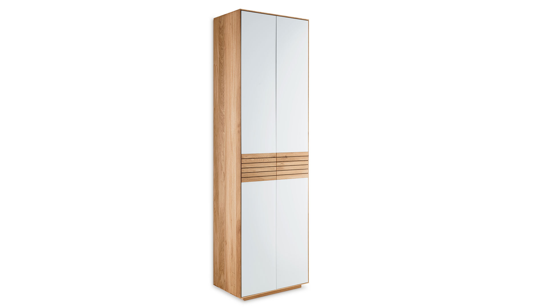 Schuhschrank "Fiella" bringt natürliche Wärme und modernen Charme in Ihren Flur. Die individuelle Maserung der massiven Wildeiche am Korpus trifft auf hell-freundliche Weißglastüren. Der Schuhschrank wirkt dadurch sowohl stilvoll als auch angenehm leicht. Hochwertige Holzakzente mit schwarz gebeizten Rillen an den Fronten lockern das Gesamtbild auf und passen so in jedes Zuhause.