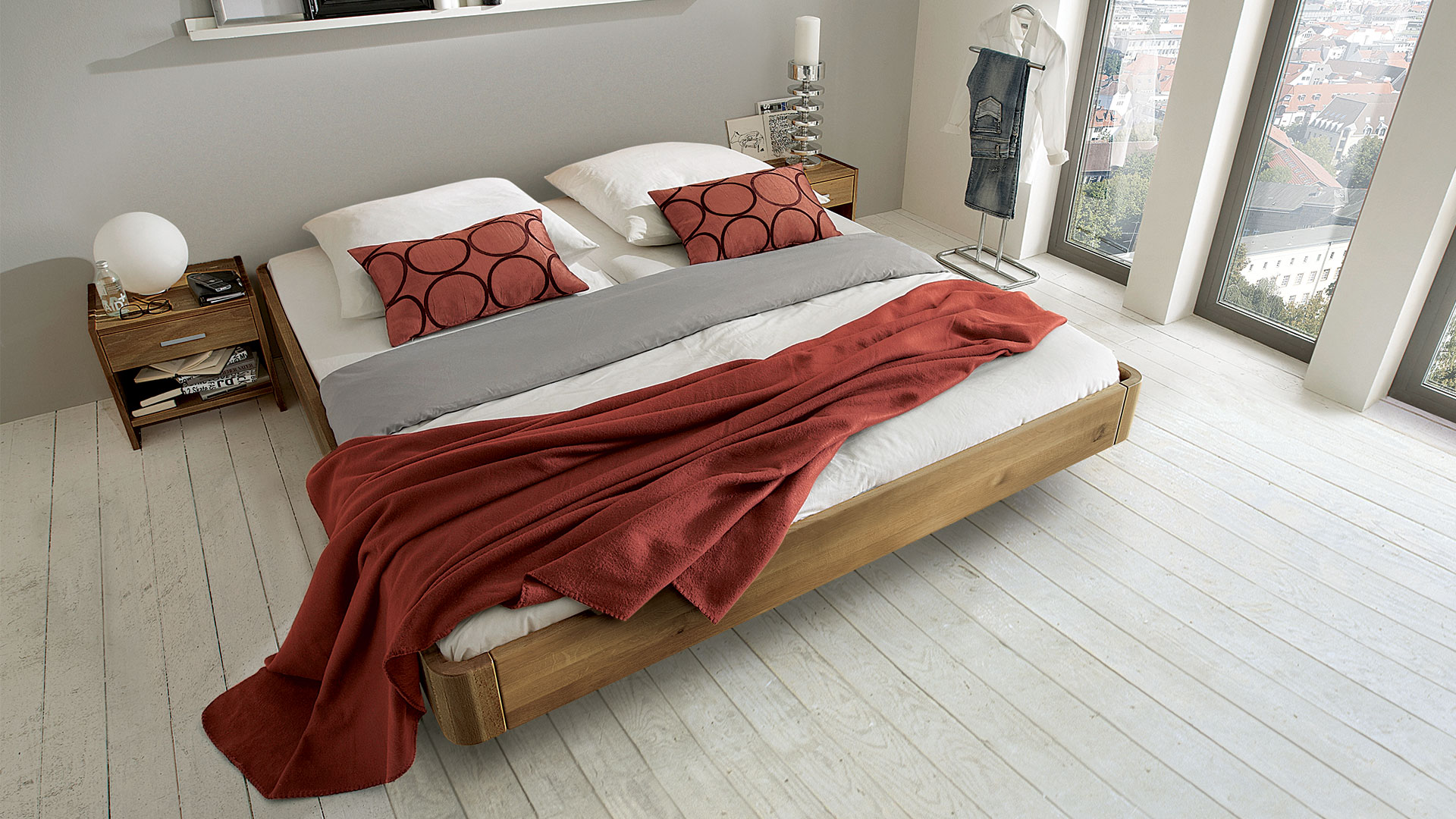 - aus massivem Kernbuchen- oder Wildeichenholz, aufwändig stabverleimt mit durchgehenden Lamellen, Rahmen am Kopfteil parkettverleimt