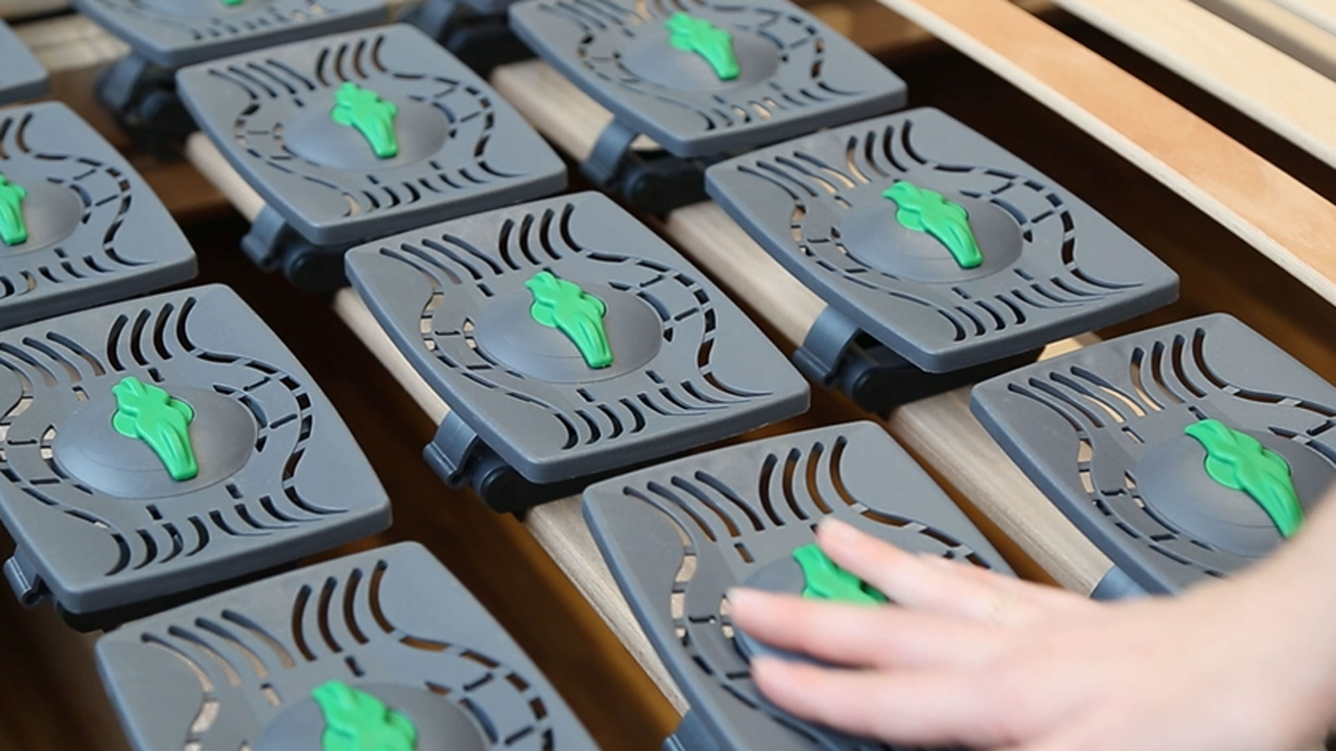 • die Härte der grauen Federleisten-Kappen (und damit die Federwirkung der Federleisten) lässt sich mithilfe des grünen Kippreglers weich oder hart einstellen - ganz, wie Sie es für Ihren entspannten Schlaf brauchen