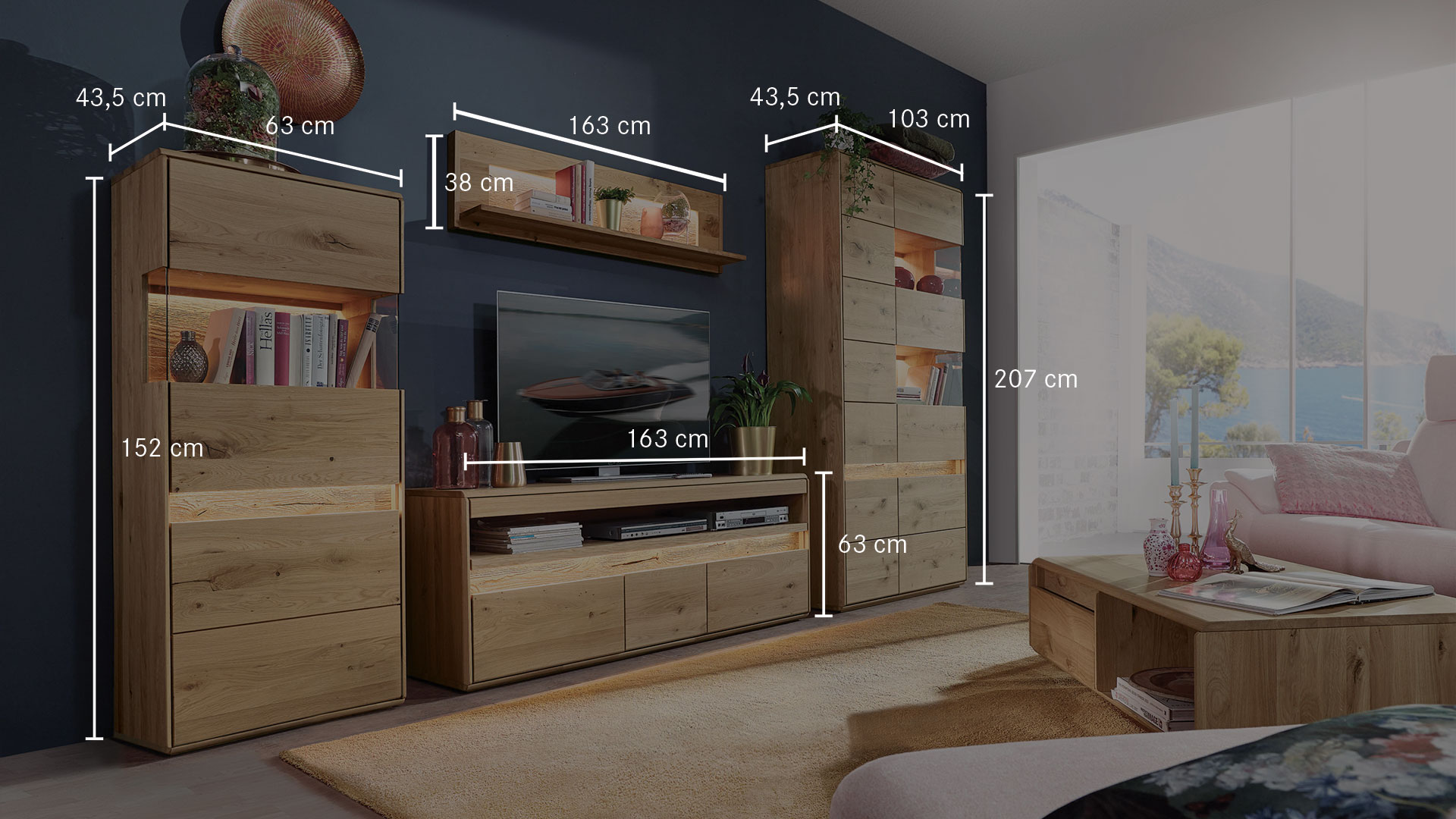 Geräumige und durchdachte Wohnwand aus edler Wildeiche mit stilvoller Beleuchtung - hier Variante 02