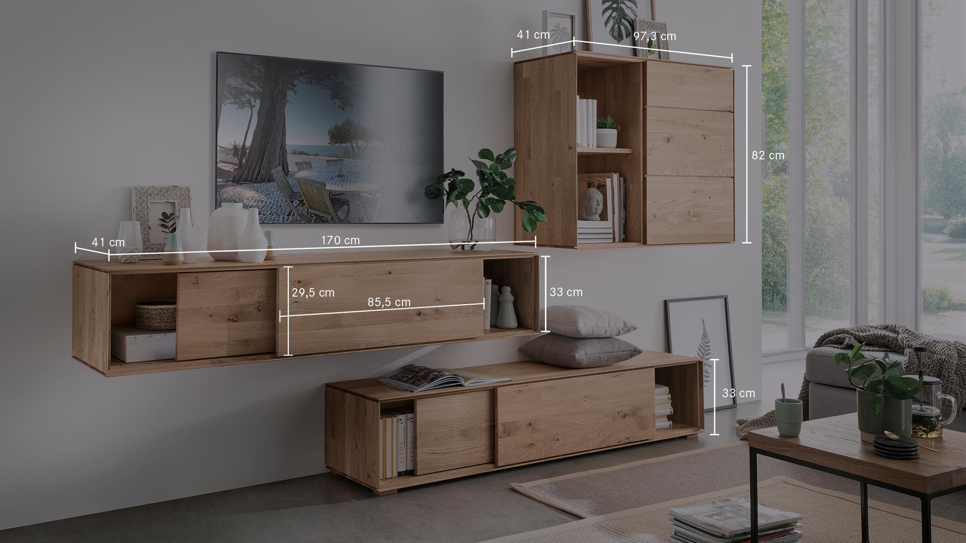 Unsere Wohnwände sind wie auf den Abbildungen erhältlich. Die Anbringung der einzelnen Module sowie deren Zwischenabstand können Sie frei gestalten. Sie können einzelne Elemente aus der Wohnwand entfernen und anderweitig verwenden oder einzelne Module aus dem jeweiligen Programm hinzukaufen. Beim Kauf einer Wohnwand erhalten Sie gegenüber einem Kauf von Einzelmodulen einen attraktiven Preisvorteil. Nutzen Sie diesen und gestalten Sie Ihren Wohnraum ganz individuell.